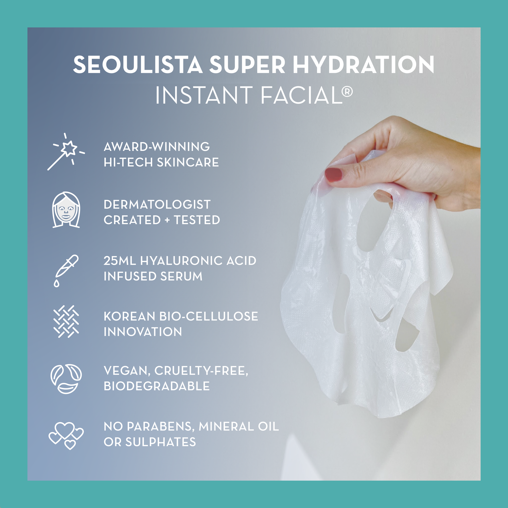 Use together for the ultimate multitasking treatment: apply Seoulista Eye Lift® Hydrate first, then layer the Seoulista Super Hydration Instant Facial® over the top for a complete hydration boost.